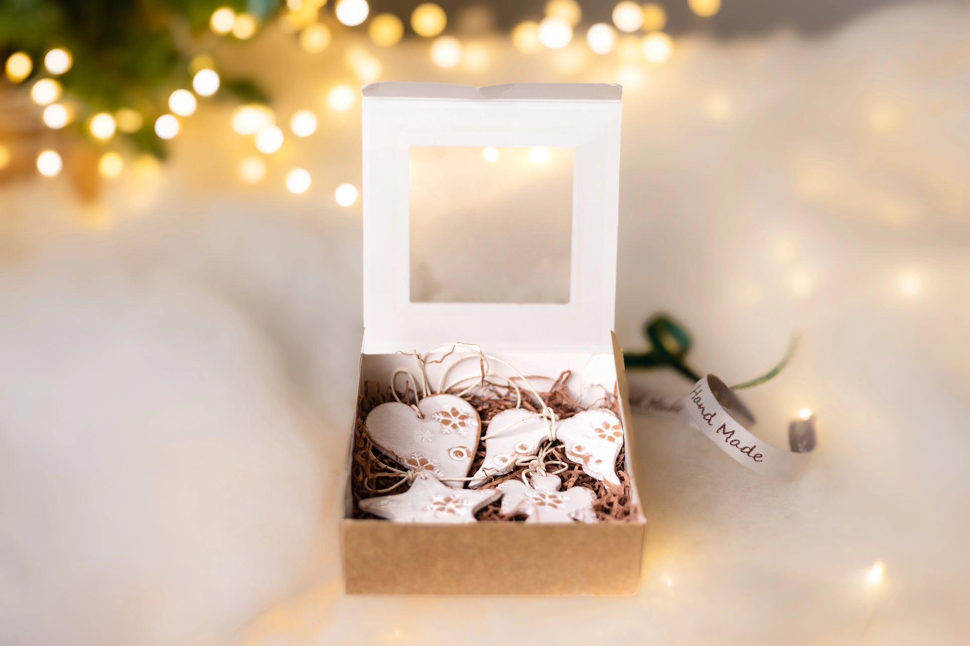 La box contiene decorazioni assortite, ognuna con forme e dettagli che evocano la calma e la luminosità del Natale.