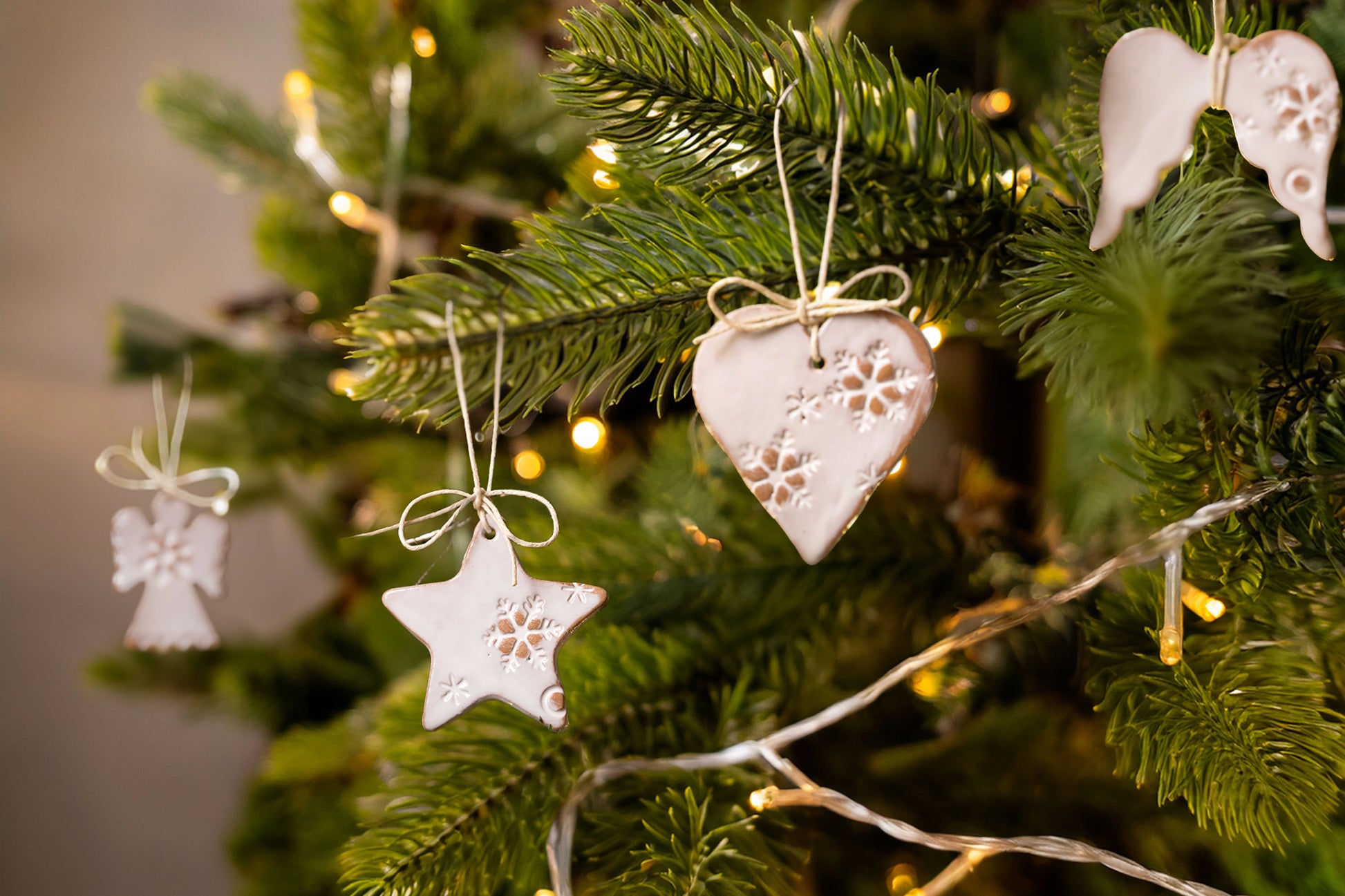 Una selezione di quattro pendenti in ceramica, modellati a mano e smaltati uno a uno, per portare sul tuo albero la bellezza delle creazioni artigianali.